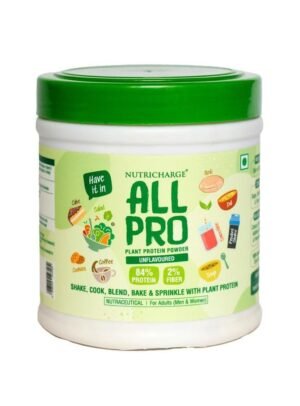 Nutricharge AllPro is a neutrally-tasting and neutrally-flavoured protein supplement. It can be mixed with any food – hot or cold, sweet or savoury, milk, curd, buttermilk, raita, soup, juice, tea, coffee, chapati, vegetable, dal-rice, salad, water, etc. without changing the taste of the dish. It can help in staying healthy and making the body fit. Nutricharge AllPro is an easy way to get three types of plant-based protein and dietary fibre for all those who are sensitive towards taste. The taste of the food does not change on adding Nutricharge AllPro to it. Its 84% protein helps fulfil the deficiency of protein in children to the elderly.