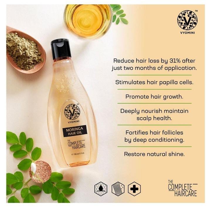 The Vyomini Hair Oil is here to unlock the shine of your hair with natural nourishment! Make this hair oil a part of your daily routine to boost hair growth and scalp health. This intensive formula is blended with pure Moringa oil, sunflower, rice bran oil, vitamin E, and RootBioTec™ (a blend of basil, coconut & sunflower oil). It helps you to regain fuller and denser hair and reduces hair loss by stimulating the dermal papilla cells in hair follicles.